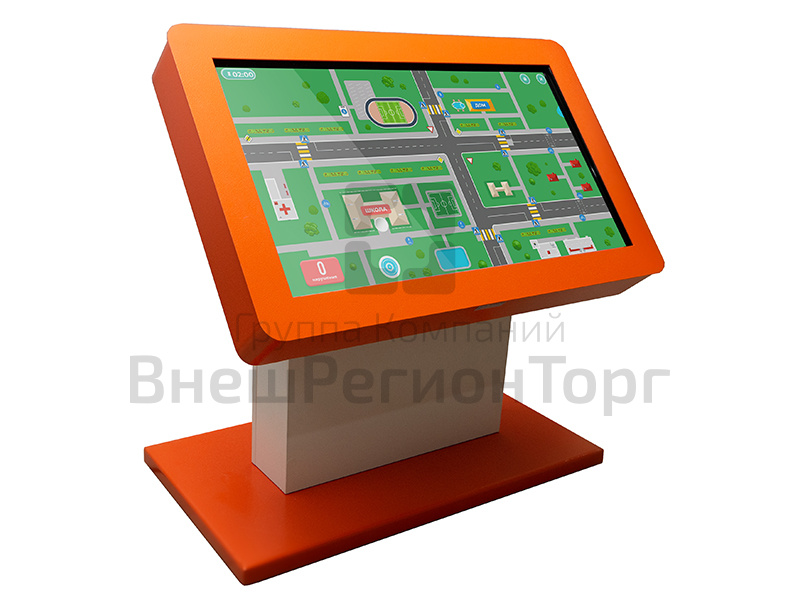 Интерактивное оборудование представляет собой сенсорную панель в горизонтальной плоскости. Вместо привычной столешницы – сенсорная панель с поддержкой функции Multi-Touch. С помощью касаний дети могут взаимодействовать с элементами на экране, изучая основы ПДД.