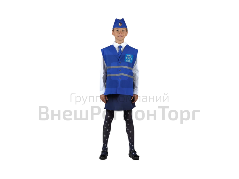 Комплект состоит из жилета, пилотки и галстука. Жилетка застегивается на пуговицы и по бокам регулируется липучками. Можно надевать на верхнюю одежду. Две светоотражающие полоски на жилете спереди и сзади. На груди эмблема ЮИД ("Юный инспектор движения").