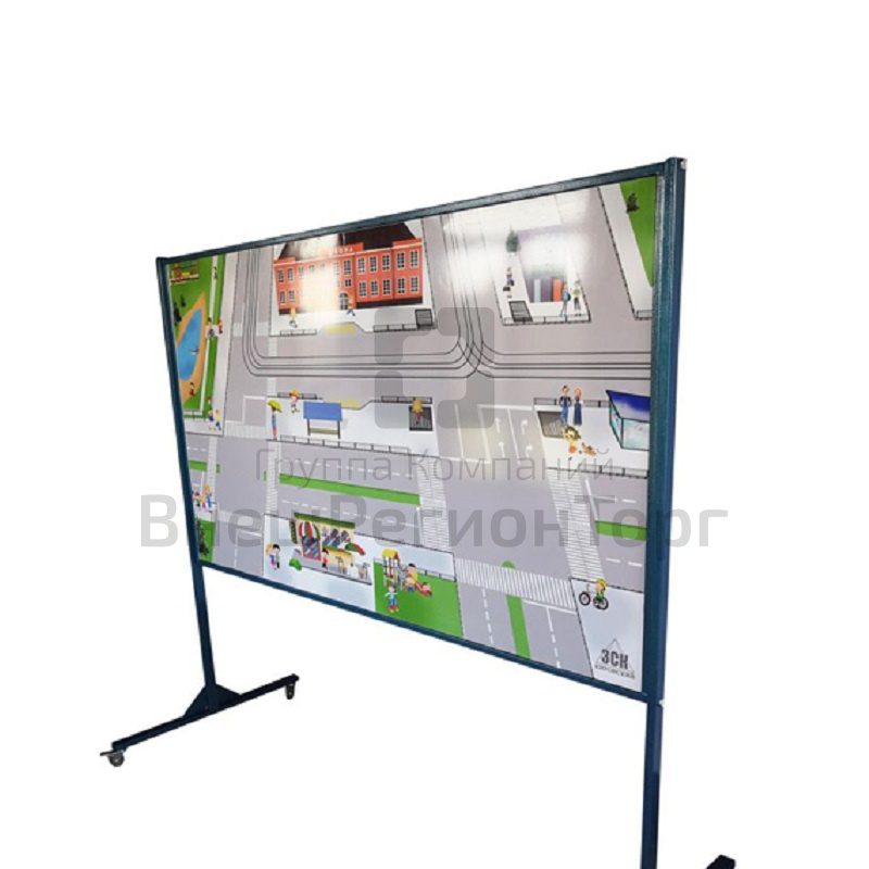 Доска на двух усиленных стойках с поворотными колесиками, на лицевой стороне которой изображен город с дорожным полотном, зданиями, переходами, остановками и т.д., а на оборотной стороне – схематичный четырехсторонний перекресток и круговое движение. Конструкция является передвижной и для удобства сборно-разборной.