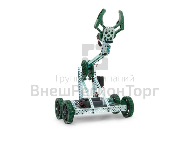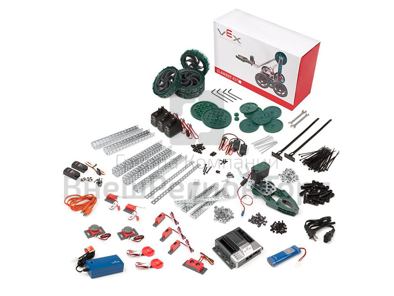 В состав набора входит: набор Clawbot, контроллер Cortex® ARM®, аккумуляторная батарея для робота и зарядное устройство, концевой выключатель - 2 шт., бампер-выключатель - 2 шт., потенциометр - 2 шт., мотор 393 со встроенным энкодером - 2 шт., ультразвуковой дальномер, трекер линии - 3 шт. Кроме того, прилагается руководство по работе с комплектом.