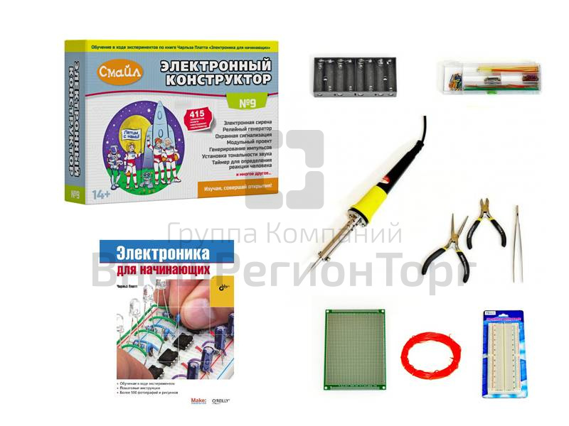 Набор №9 - это набор с максимальной комплектацией, включающей в себя элементную базу (415 деталей), книгу Чарльза Платта "Электроника для начинающих" и инструменты (паяльник, кусачки, пинцет, утконосы и мультиметр).