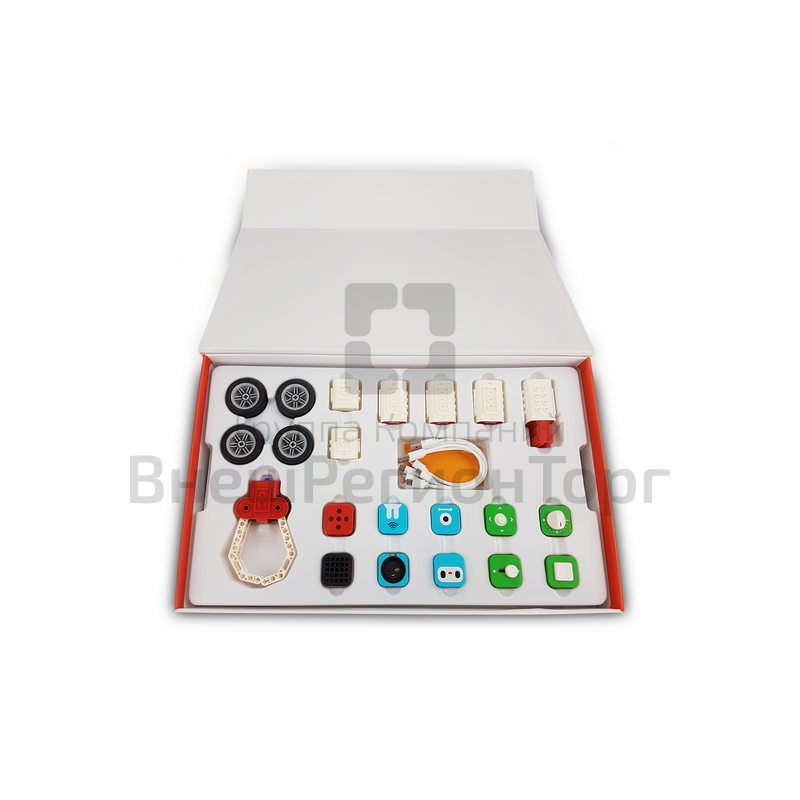 - Электронные компоненты (электромоторы, сервомотор, датчик расстояния, датчик касания, датчик цвета, датчик звука, датчик черной линии, кнопка вкл/выкл, ползунок регулирования скорости, ручка регулирования скорости и направления вращения мотора, джойстик, пиксельная панель).