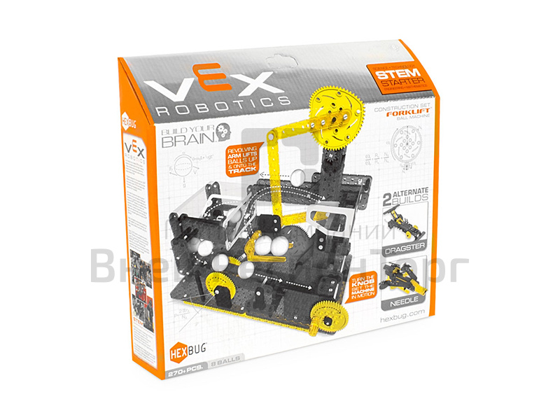VEX by HEXBUG специализируется на вдохновении будущих поколений инженеров робототехники за счет радостного возбуждения и практического обучения с наборами конструкторов по направлениям наука, технология, инжиниринг и математика (STEM), например, этой машины вилочного подъемника шаров VEX by HEXBUG Шариковая машина. Эта машина дает важные знания по кинематике, тягам, возвратно-поступательному движению, синхронизации и последствия этих принципов для всей системы.