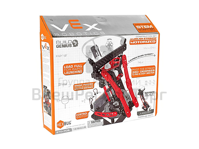 Эта машина собирается из более чем 300 деталей и выстреливает шар за шаром со скоростью один шар в секунду (прилагаются 12 шаров). При сборке этой машины ее сборщики могут изучить важные научные принципы, например, действие тяг, возвратно-поступательное движение и движение метательных снарядов. VEX by HEXBUG специализируется на вдохновении будущих поколений инженеров робототехники за счет радостного возбуждения и практического обучения с наборами конструкторов по направлениям наука, технология, инжиниринг и математика (STEM), например, этой машины VEX by HEXBUG Шариковый метатель .