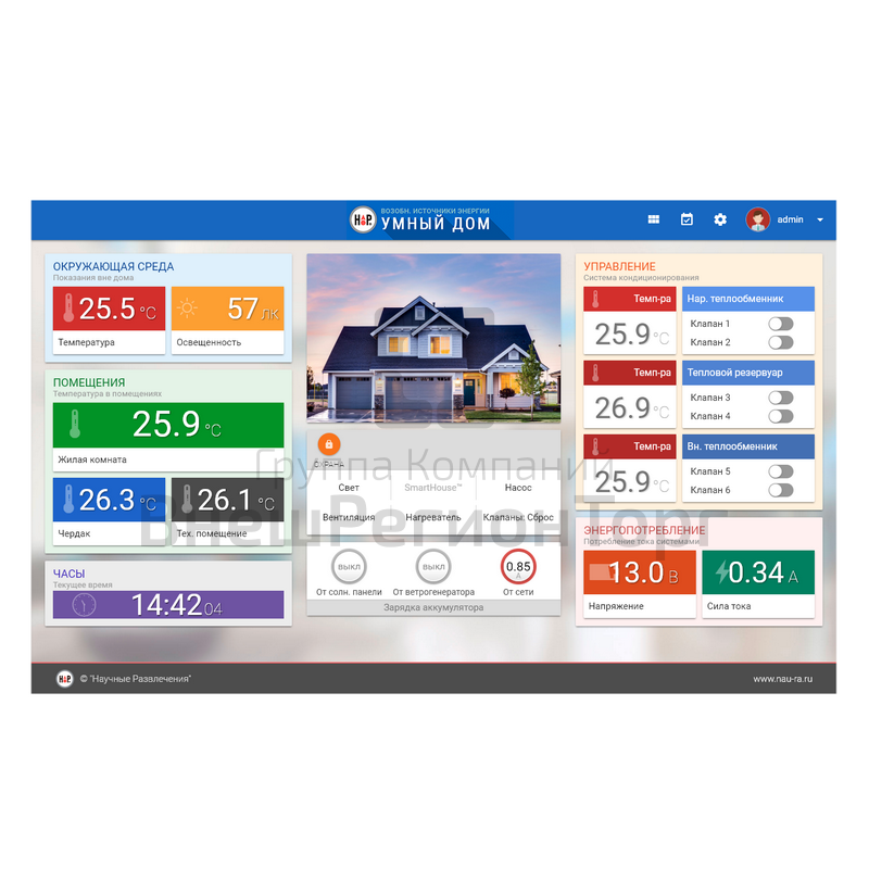 Корпус модели дома включает: комплект датчиков, комплект исполнительных устройств и механизмов, комплект элементов гидравлической схемы, микрокомпьютер с платой расширения, понижающий преобразователь напряжения, плату драйвера силовой электроники, плату подключения источников энергии, блок реле, аккумулятор с платой защиты, панель солнечной батареи.