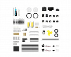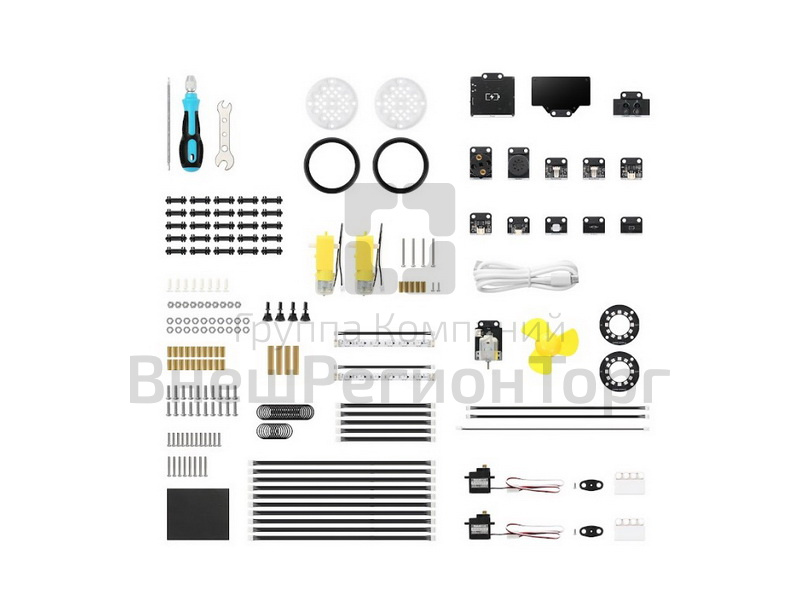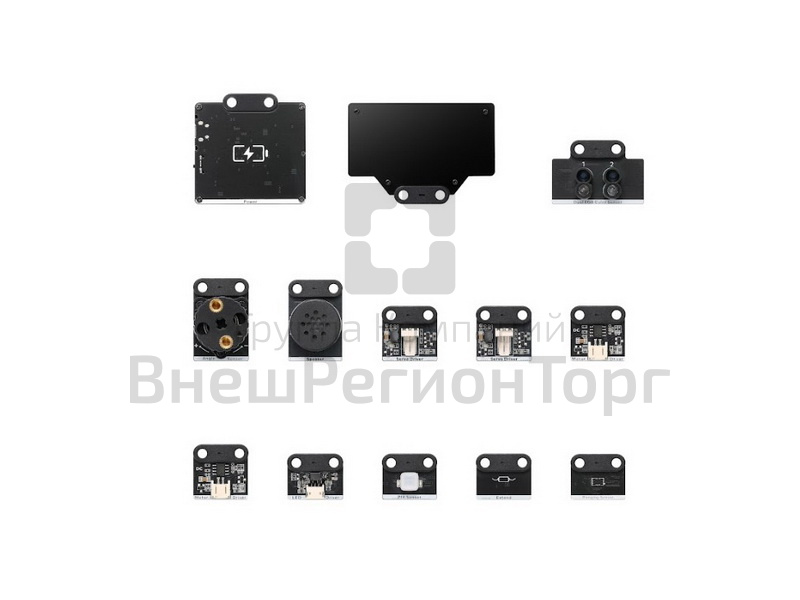 Набор содержит динамик, мотор, светодиодную ленту, светодиодное кольцо, светодиодную матрицу, вентилятор, датчик дальности, ИК-датчик движения, двойной датчик цвета, датчик угла поворота, блок расширения и литиевый АКБ.