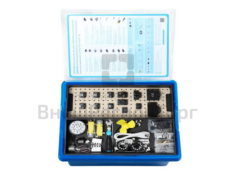 Набор содержит динамик, мотор, светодиодную ленту, светодиодное кольцо, светодиодную матрицу, вентилятор, датчик дальности, ИК-датчик движения, двойной датчик цвета, датчик угла поворота, блок расширения и литиевый АКБ.