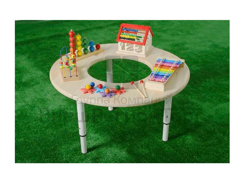 Стол отлично подойдет как для самостоятельных игр детей, так и для занятий с воспитателями, родителями и психологами. Модель представляет собой круглый стол с развивающими элементами: ксилофон, домиком-счетами, лабиринтом, пирамидкой и другими красочными инструментами.