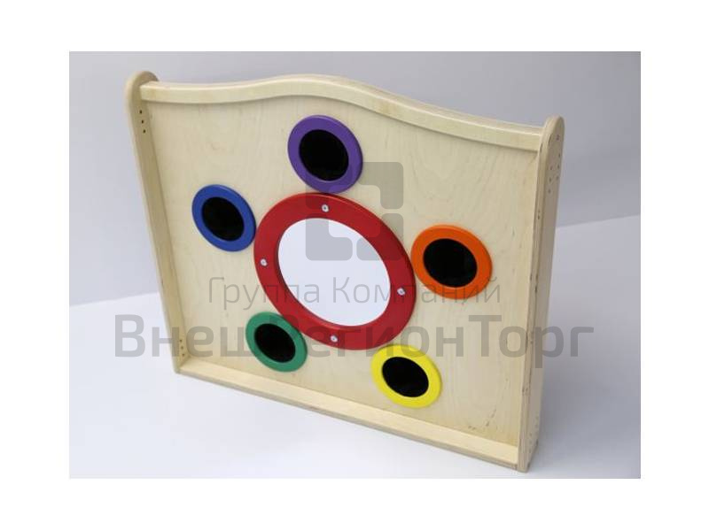 Для обучения и игр можно использовать самые разные материалы - маленькие игрушки, части конструктора “Лего”, камешки, орехи. Посередине панели также закреплено круглое зеркало.