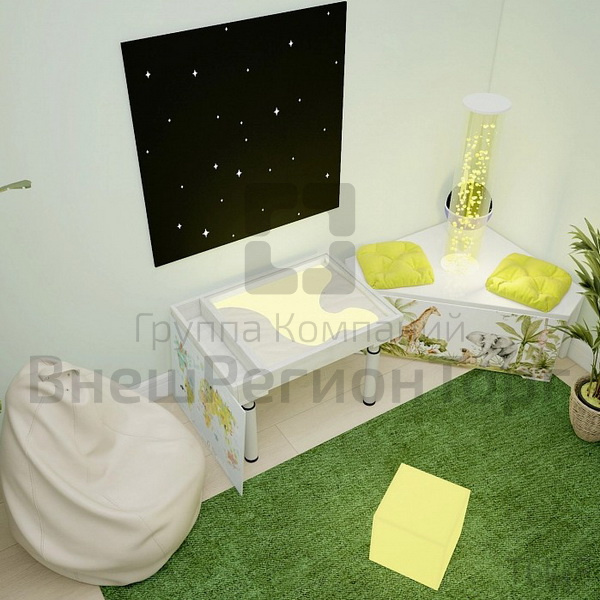 Такую сенсорную комнату можно компактно разместить в детском саду (на небольшой территории), в группе для занятий с детьми узкими специалистами (психологами, дефектологами, логопедами).