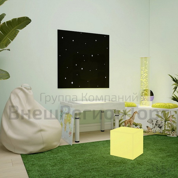 Такую сенсорную комнату можно компактно разместить в детском саду (на небольшой территории), в группе для занятий с детьми узкими специалистами (психологами, дефектологами, логопедами).