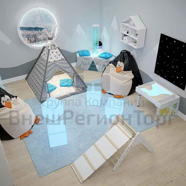 Такая сенсорная комната - идеальное решение для детских садов, групп и других образовательных учреждений. Она может быть компактно установлена на небольшой площади и и легко интегрирована в существующие помещения. Мы предлагаем полный комплект сенсорных устройств, включая специальные настенные панели, мягкие полы и сиденья, а также управляющую систему, которая позволяет настраивать и контролировать воздействия в комнате.