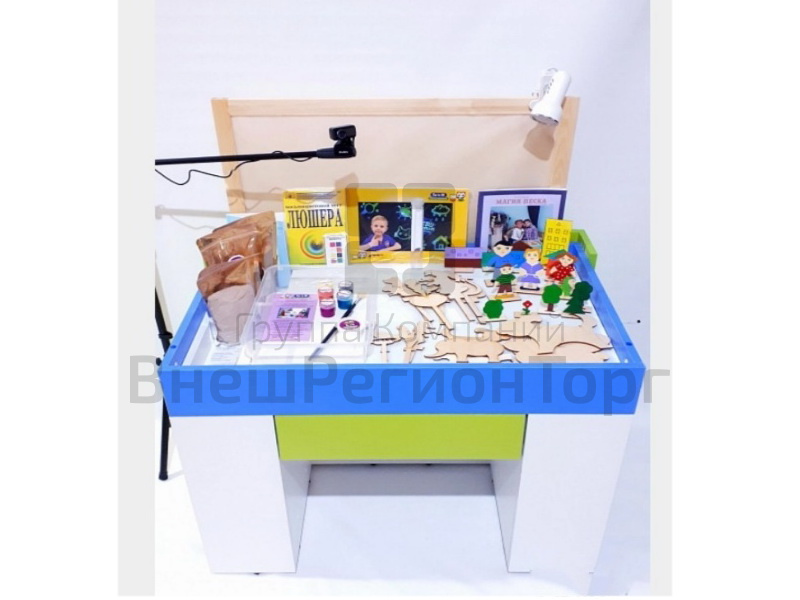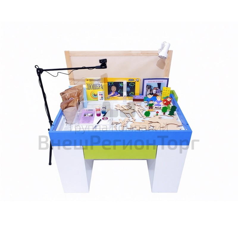 Универсальный модуль для рисования песком, акварелью, театрального, логопедического и психологического развития выполнен в ярких и красочных тонах. Он представляет собой целостную нераздельную конструкцию в виде стола со встроенной светодиодной подсветкой, имеющей функцию переключения цветов и оттенков и технологическими полостями для хранения комплектующих и расходных материалов, входящих в комплект.