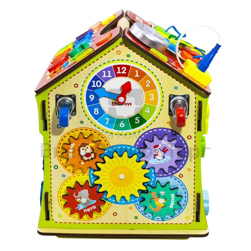 - Многофункциональность: на стенах бизидома вы увидите разнообразные лабиринты, колесики, шестеренки, циферблат со стрелками, колокольчик, дверцы с разнообразными замками, молнии и шнуровки. На крыше дома вы увидите сортер с разноцветными цифрами и геометрическими фигурами, розетку и светильник.