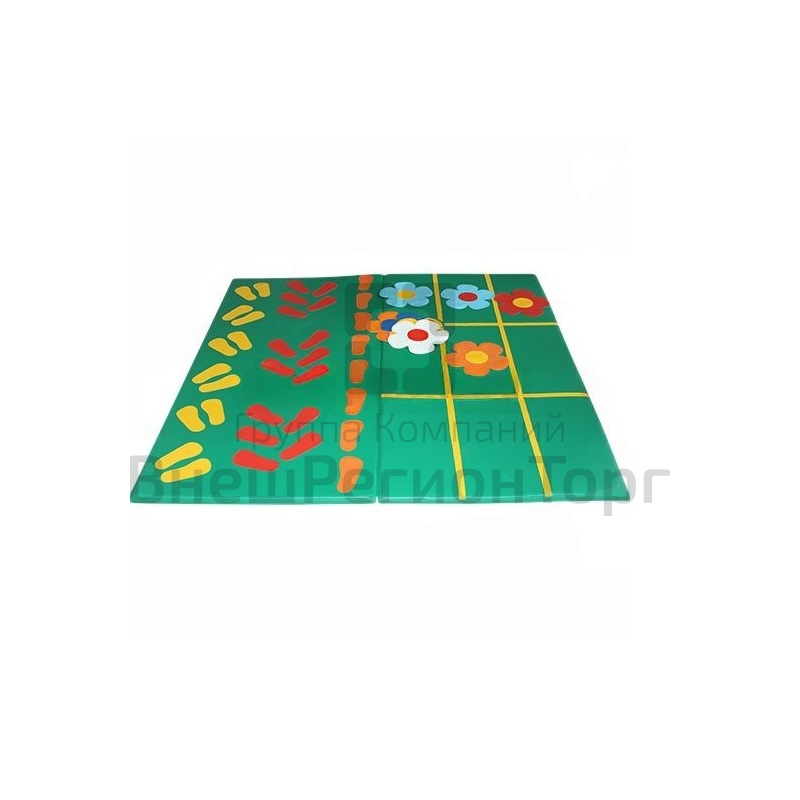 Мат "Полянка" изготавливается с аппликацией: на одной стороне аппликация в виде дорожки со следочками, на другой "расчерченные" клетки, на третей и четвертой стороне нашиты цветочки разных цветов, цвета которых повторяются на цветочках, которые отдельно скомплектованы с матом. Воздействует на рецепторы стопы, стимулирующие внутренние органы, способствует профилактике плоскосотопия, оказывает оздоровительный эффект. Развитие вестибулярного аппарата, координации движений, речи, умения передавать ощущения, эмоции в речи.