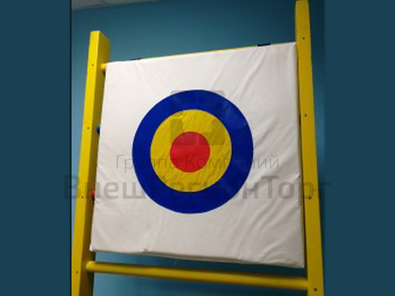 Изготовлен из винилискожи, наполнитель поролон. Щит крепится на шведскую стенку при помощи липучек. Размер 70х70 см, толщина 2 см.