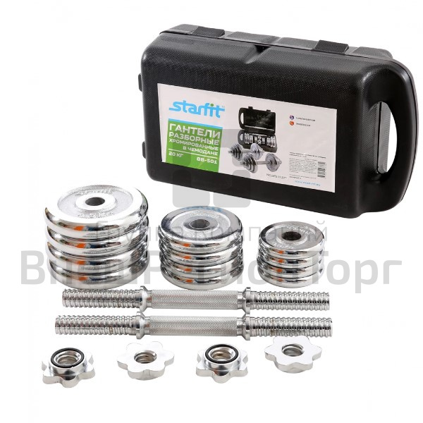 Набор из двух гантелей в компактном пластиковом чемодане, который удобно хранить и брать с собой на тренировку. Гантели выполнены из хромированной стали.