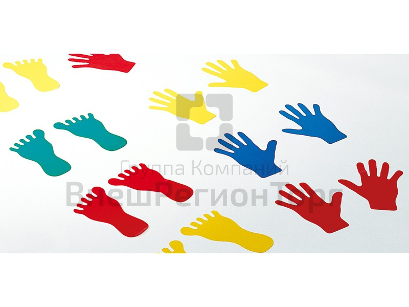 Комплект разметок «Руки-ноги» включает в себя набор из 22 ладошек и 22 ступней. При помощи данной разметки можно строить различные дорожки для детей, для прохождения которых дети могут использовать и руки и ноги одновременно.