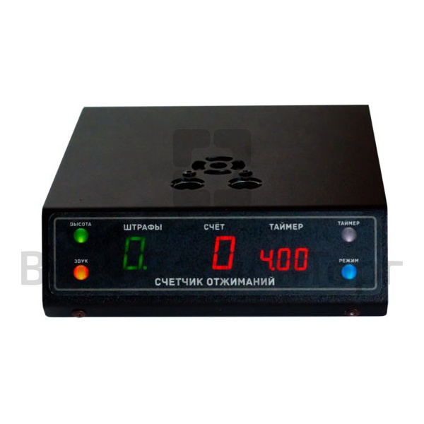 Голосовой счетчик отжиманий служит для приема нормативов, проведения соревнований по полиатлону и тренировок. Сигнал о сгибании рук в упоре лежа фиксируется и отображается световым и звуковым способом. Важной особенностью данной модели является два режима работы: бесконтактный (высота срабатывания настраивается до начала тестирования) и контактный (срабатывает при касании платформы грудью).