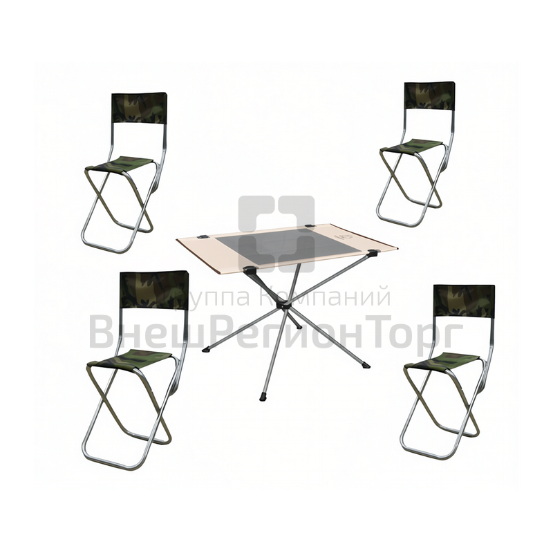 Комплект состоит: стол раскладной – 1 шт, стул раскладной – 4 шт. Стол складной. Материал столешницы — полиэстер, материал каркаса — алюминий. Стул раскладной со спинкой без подлокотников. Каркас стула выполнен из стальной трубы, покрыт порошковой краской. Сиденье и спинка стула выполнены из ткани двойного сложения