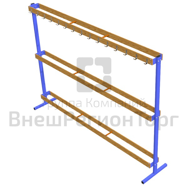 Стойка-стеллаж предназначен для хранения 30 пар лыж. Стойки изготовлены из профильной трубы 40х40мм, планки изготовлены из фанеры толщиной 12 мм, фанера покрыта лаком на водной основе. Стойки окрашены методом порошкового напыления. Размеры: длина 2100мм, высота 1950мм, глубина 500мм. Конструкция сборно-разборная, двухстороннее расположение лыж.