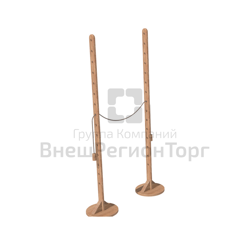 Комплект состоит из двух деревянных вертикальных стоек. Вместо планки используется полиамидный шнур длиной 3 метра диаметром 8мм. Для детей шнур намного безопаснее, чем жесткая планка. Стойки изготовлены из многослойной березовой фанеры толщиной 18 мм, покрыты безопасным лаком на водной основе. Для установки шнура на каждой стойке сделаны 14 отверстий диам. 25 мм. Диаметр опорных площадок 230 мм.