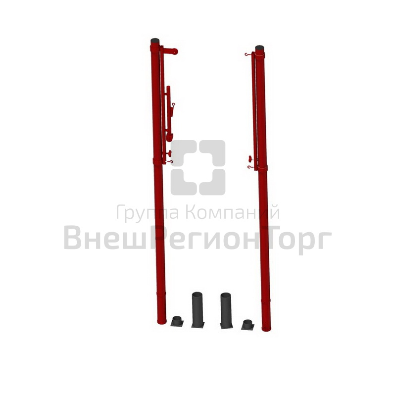 Представляют собой сборную конструкцию, состоящую из вертикальных стоек, подвижной каретки, закладных стаканов с крышками. На одной из подвижных кареток закреплен натяжитель, выполненный из домкрата. Изготовлены из стальной трубы 76мм. Вся конструкция покрыта порошковой эмалью. Без сетки. Общая высота стойки 2800мм, высота стаканов 300мм, диаметр стаканов 89мм. Длина подвижной каретки - 1160 мм.