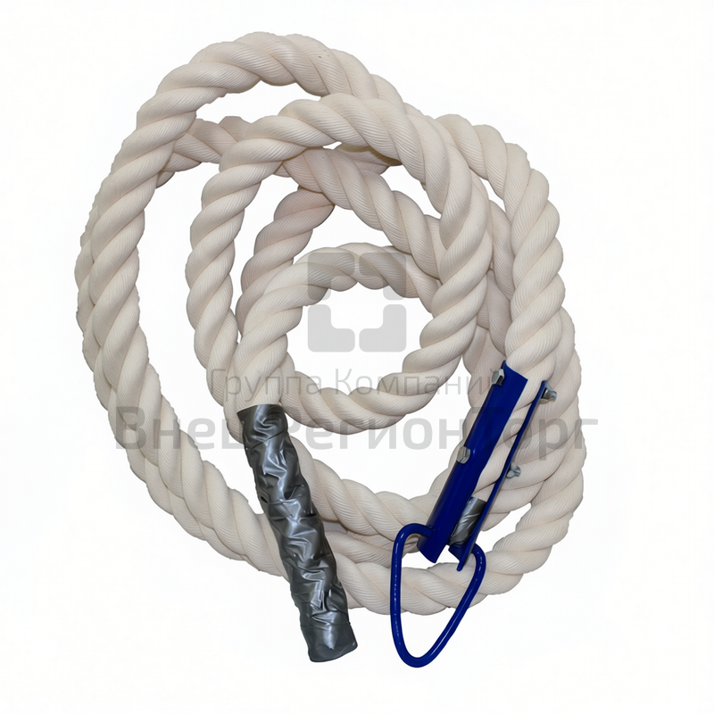 Канат хлопчатобумажный, Ø 4см - фактическая разрывная нагрузка,кгс, не менее 80, линейная плотность, ктекс, 10,5. На одном конце каната, предназначенного для лазанья, крепится стальная серьга, зафиксированная в металлических щеках - для крепления к консоли, а на другом закреплен декоративный чехол, который не позволяет канату выйти из строя в процессе эксплуатации (размотаться).