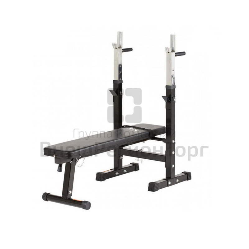 Скамья силовая со стойками под штангу. Предназначена для выполнения различных упражнений: жим штанги лежа, отжимания на брусьях и другие. Стойки тренажера регулируются по высоте в 5 положениях в диапазоне от 79 до 99 см. Две рукоятки с обратной стороны стоек предназначены для отжиманий. Складная конструкция позволит сложить скамью после занятий. Тренажер занимает совсем мало места.