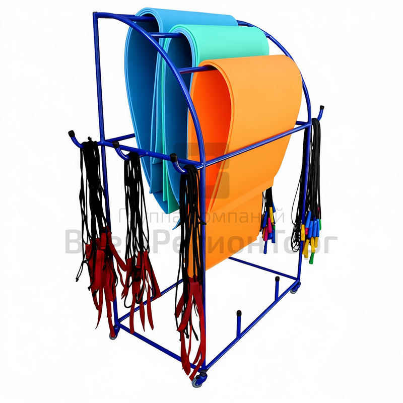 Комплект для групповых занятий. Выполнен в виде стеллажа тележки для хранения на колесиках - Цельносварная стойка сконструирована особым образом, позволяет компактно разместить различное гимнастическое оборудование, такое как коврики, скакалки, эспандеры различных конфигураций, гимнастические палки и другой инвентарь по Вашему усмотрению. Колесики позволят легко и быстро переместить стойку, не прикладывая значительных усилий.