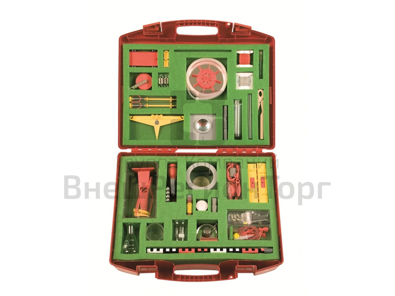 Магнитные стержни, штатив, баллонный клапан, отсек для батареек, стеклянная пипетка, мензурки, колба Эрленмейера, пробирка с подставкой динамометры, разновесы, блоки, модели автомобилей и тележек, стеклянные и пластмассовые шарики, резонаторы, гребное колесо, стеклянные трубки, колбы, экраны из пластика, резиновые кольца и пробки, трубки, шнуры, коромысло весов, рубильник, спиртовка, спринцовка, нагревательная проволока, зажимы, камертон, спички, магнитная стрелка, свечи в металлических подставках, медный провод, фонарь, термометр, воронка, патрон для лампы, линзы, соединительные провода, надувные шарики, картушка компаса, аксессуары.