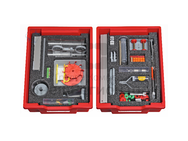 Комплект содержит все материалы и приборы, необходимые для изучения основных законов механики твердых, жидких и газообразных тел. Более 50 элементов размещаются в двух поддонах с прозрачными крышками.