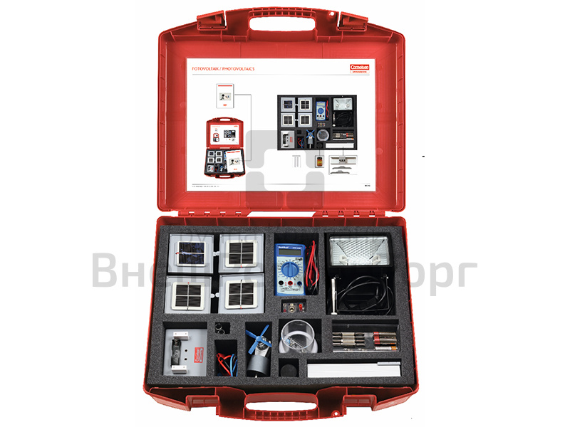 Комплект содержит оборудование для выполнения экспериментов по изучению процесса преобразования солнечной энергии в электрическую.