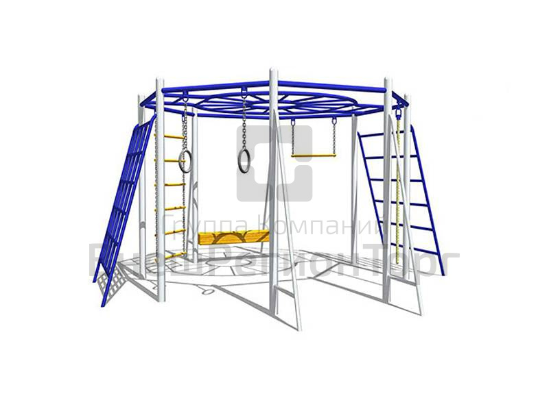 В комплекте кольца гимнастические, канат, лестница, перекладина на цепи, бревно.