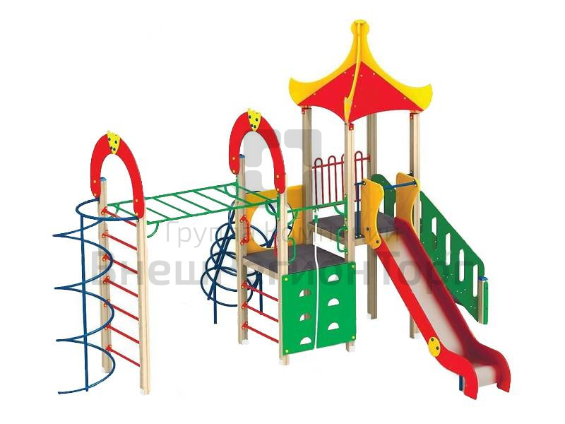 В состав многофункциональной детской площадки входят: горка-спуск, лестницы с безопасными перилами, шведская стенка с рукоходом, шест-спираль, лиана (тоннель) и небольшая альпинистская стенка с канатом.