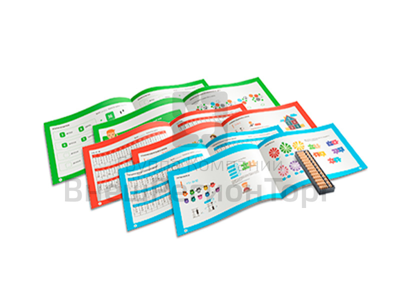 Комплект состоит из 3 учебников и 3 рабочих тетрадей всех трёх уровней. В комплекте детский абакус