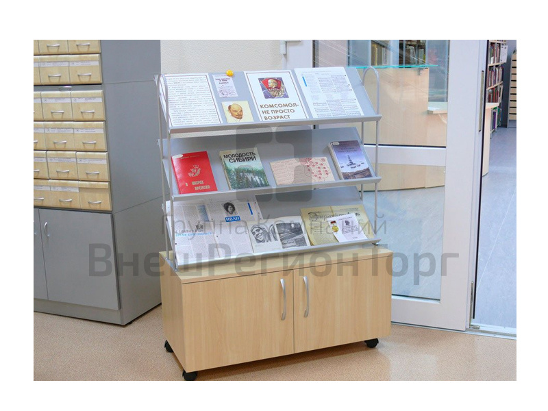 Подробное описание Стенд информ.мобильн.3 мет.полки на тумбе 900х400х1200