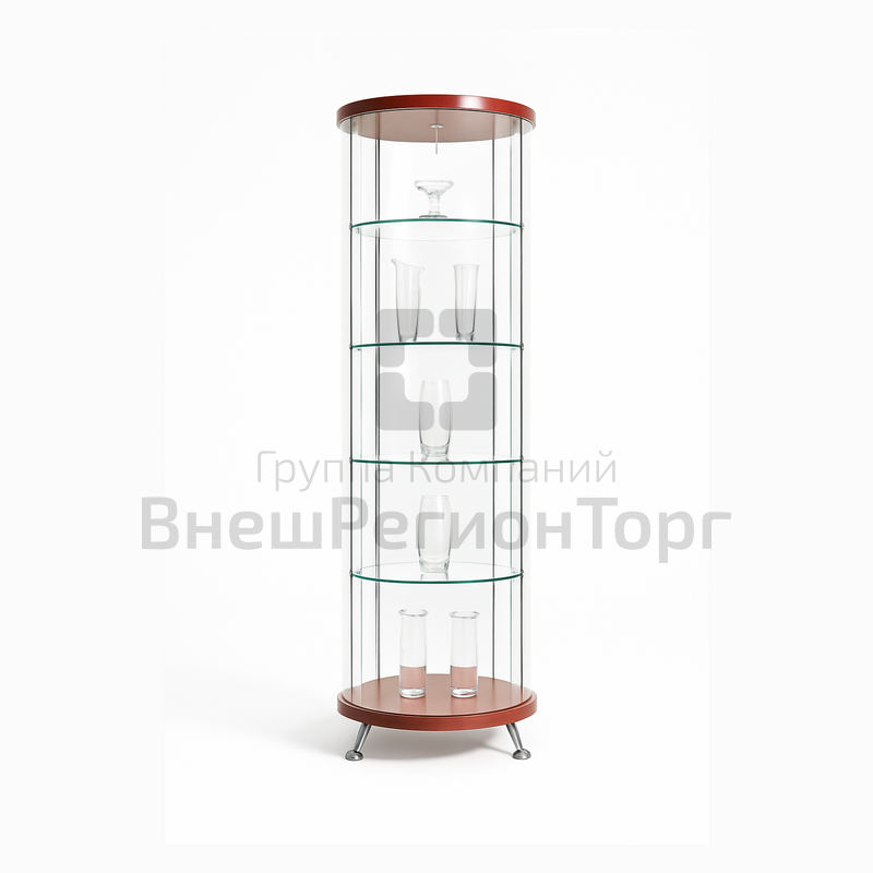 Круглая стеклянная витрина для торговли на узком основании толщиной 35 мм. В комплект витрины входят: 4 стеклянные полки, светильник 20 Вт, 4 ножки, замок, трансформатор 220/12 В мощностью 60 Вт, шнур с выключателем и вилкой 1,5 м.